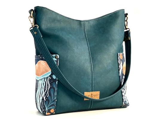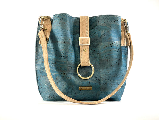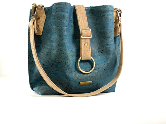 Deep Teal Cork Bag with Sea Turtle Details - Removable Crossbody Strap