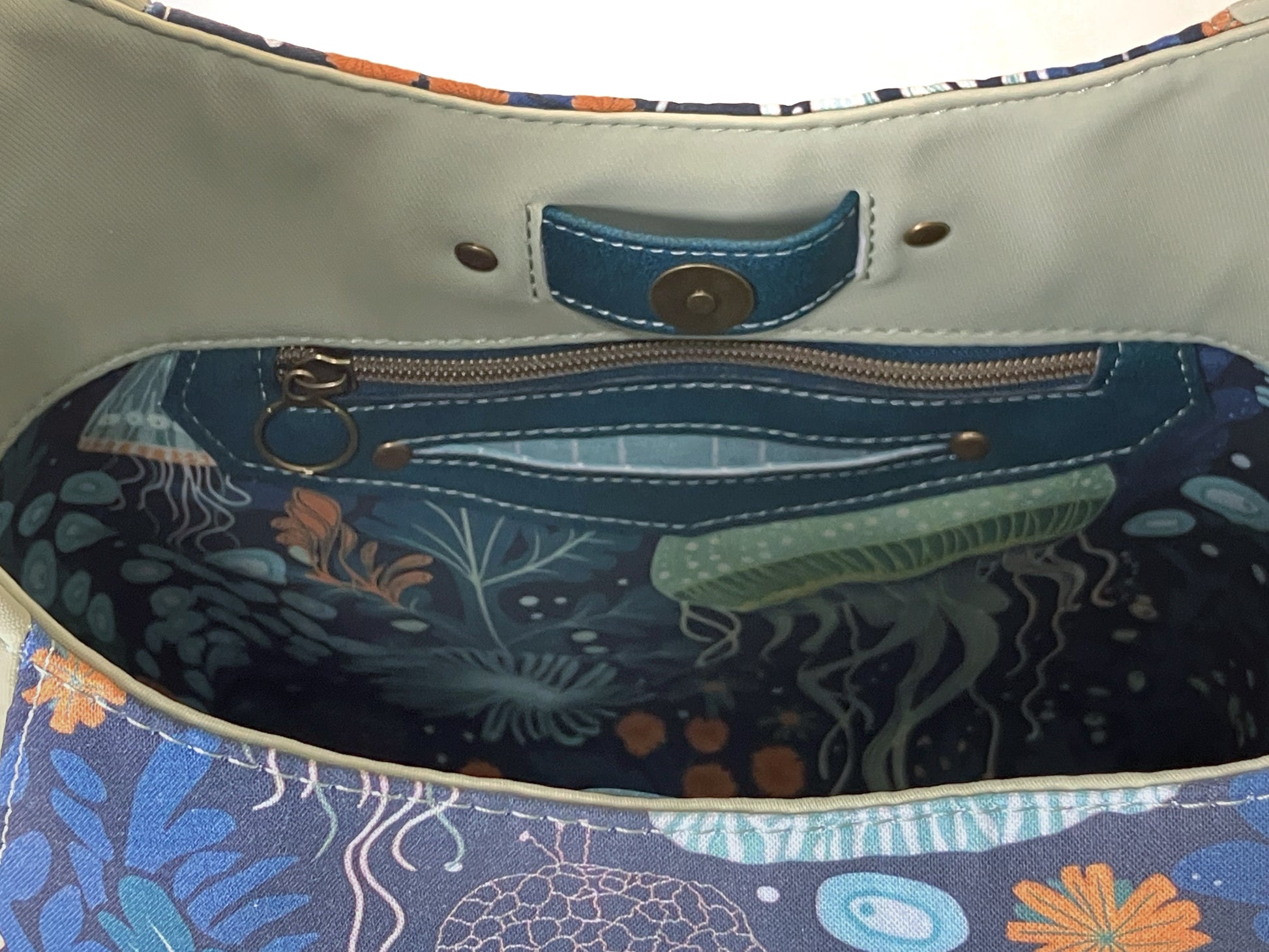 A handmade shoulder bag with a sculpted silhouette and coastal feel. The jellyfish print fabric sets a deep ocean mood, framed by panels of teal and green vinyl for contrast.